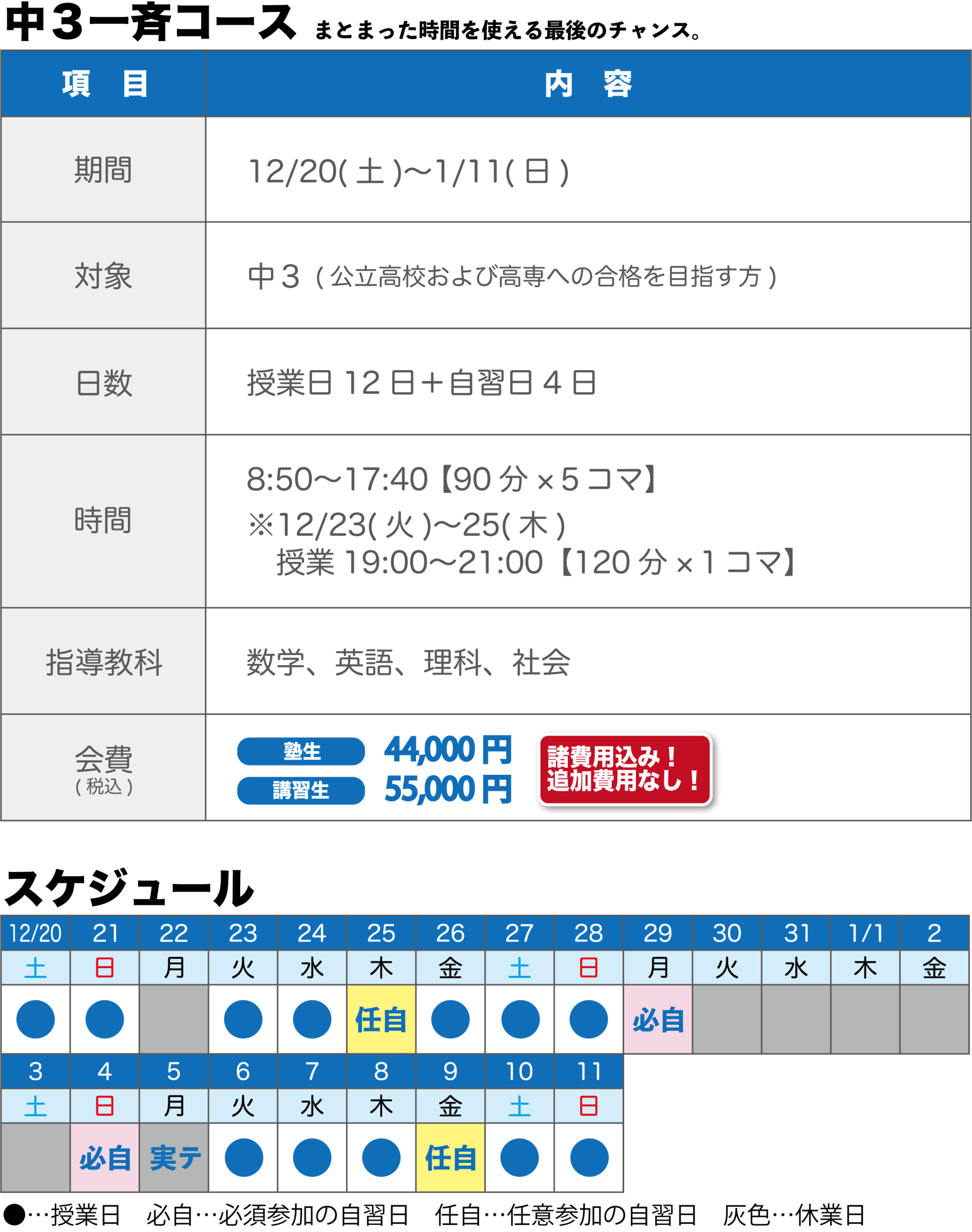個別コース(中1・2対象)は、冬期講習会を実施せず、冬休み期間も通常授業を継続実施して参ります。詳しくは通常授業案内のページをご覧ください。